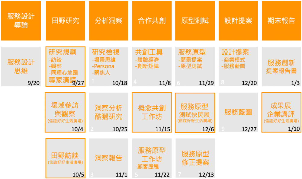 2019年度的服務創新與設計,將延續上學期設計方法初探的親子創新設計為基礎,以服務設計思維為主軸,用業界專案執行的實務操作,為信誼好好生活廣場,重新梳理顧客人物誌、洞察顧客價值。
